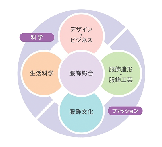 服飾を科学とファッションの両面から捉え、服飾文化、服飾造形・服飾工芸、生活科学、デザイン・ビジネスの全分野に対する基礎学力を磨く。