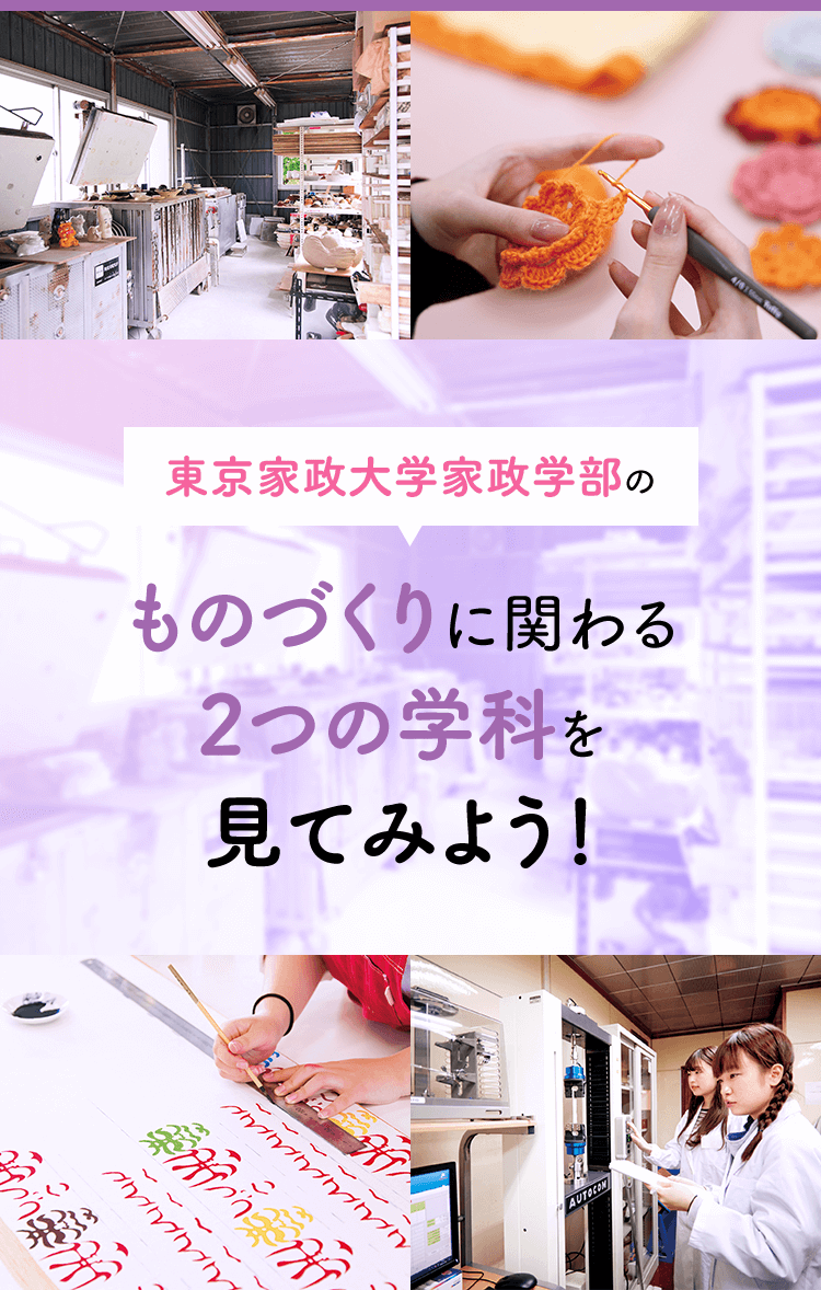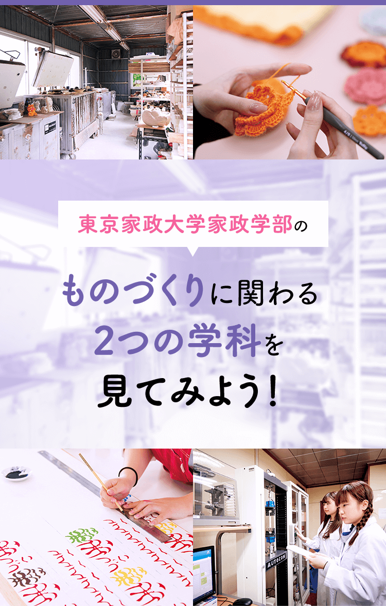 服飾を科学とファッションの両面から捉え、服飾文化、服飾造形・服飾工芸、生活科学、デザイン・ビジネスの全分野に対する基礎学力を磨く。