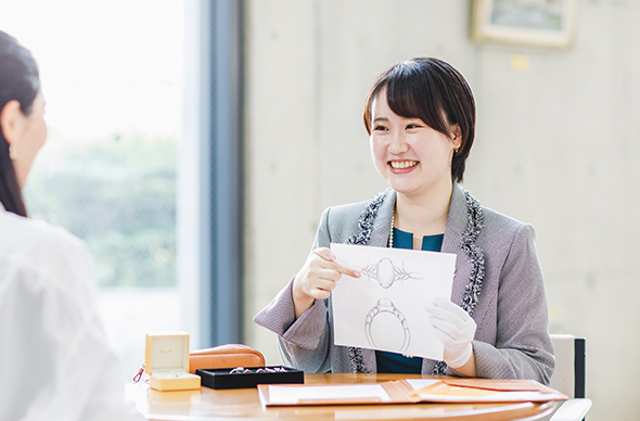 描いたデザインが実際にジュエリーになるときは、緊張の瞬間。世界で一つだけのジュエリーづくりに携われることが大きなやりがいです。結婚指輪ならカップルのお二人にとって一生の記念になるものですし、価格も安いものではありません。大きな価値を動かしているのだと、身が引き締まる思いです。今はブライダルが主な担当ですが、より自由度の高いファッションジュエリーや、時計のデザインにも挑戦してみたいですね。
