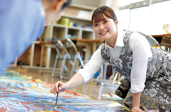 造形表現学科では、学生一人ひとりの個性に応じた助言や支援を行い、主体的に行動できる自立した心と感性を育て、自分の造形表現力を社会に生かせる人材を育成しています。幅広い分野を学べるため、将来の可能性も多様に広がります。