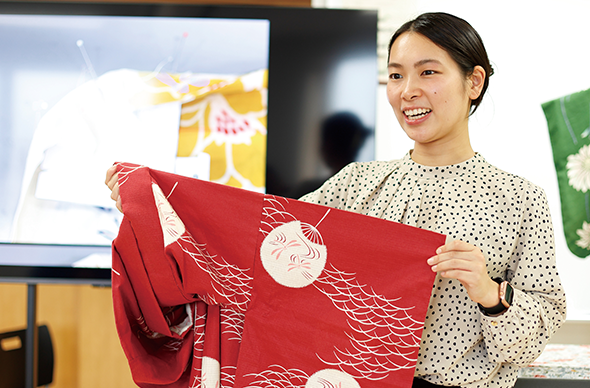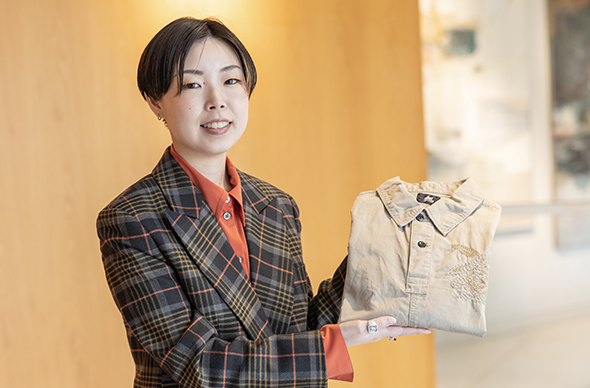 オープンキャンパスで見たファッションショーの動画にひかれて入学。和裁や洋裁、立体裁断といった技術的な授業や実習のほか、学園祭でファッションショーを行う服飾団体「EVE」での活動が印象深いです。仲間と協力して服を作る過程も楽しく、最終的に一つのショーとして完成し、感動を味わいました。服飾に関する基礎知識を身につけられたので、商品の売り出しポイントをスムーズに理解でき、お客様にわかりやすく伝えられています。また、授業や実験で学んだ生地の特性などは、購入後のケアのアドバイスにつながり、喜んでいただけます。